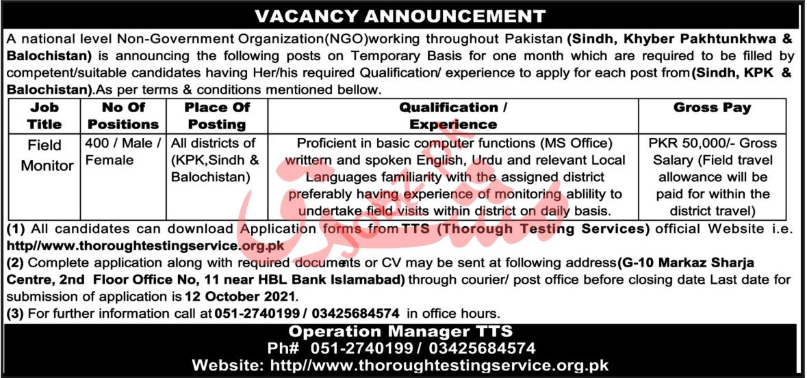 Field Monitor Jobs In Non Government Organization NGO