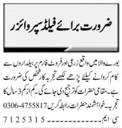 Dairy Farm jobs advertisement dated about 11 November 2022 in daily Jang Newspaper invites application for the vacant post of supervisor and field supervisor in Multan, multan Punjab Pakistan. Persons with Bachelor, Intermediate and Matric etc. education can apply.