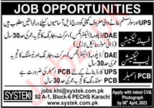 Systek invites applications for job positions advertised in daily Jang dated 26 March 2023 for following vacancies in Karachi, karachi Sindh Pakistan.