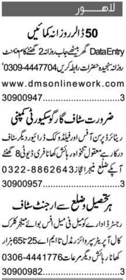 Private Company Lahore, lahore Punjab Pakistan invites applications from eligible candidates for the post of field worker, clerk, cook, supervisor, driver, call operator, manager, data entry operator, office staff and office boy as per advertisement of November 27, 2024 published in daily Express Newspaper. Persons with Bachelor, BA, Middle, Matric and Intermediate etc. education can apply.