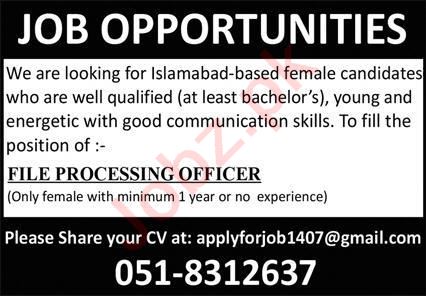 Private Company jobs advertisement dated about 28 May 2023 in daily Express Newspaper invites application for the vacant post of file processing officer in Islamabad, islamabad Islamabad Pakistan. Preferred Education is Bachelor etc.