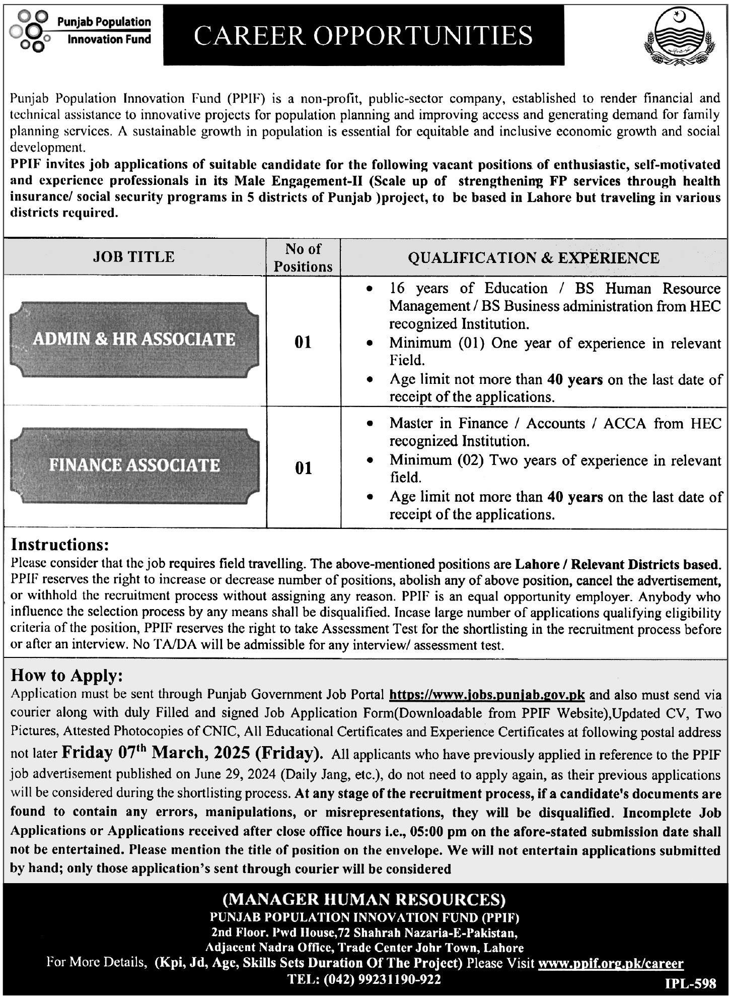 Punjab Population Innovation Fund PPIF jobs advertisement dated about 14 February 2025 in daily Express Tribune Newspaper invites application for the vacant post of admin associate, finance associate and hr associate in Lahore, lahore Punjab Pakistan. Persons with ACCA and Master etc. education can apply.