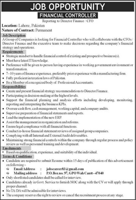 Vacant posts including finance controller are announced in Public Sector Organization Lahore, lahore Punjab Pakistan as per 24 February 2022 advertisement in daily The News Newspaper. Bachelor and Master etc. educational qualification will be preferred.