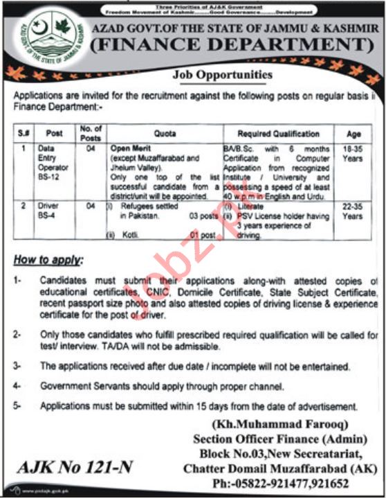 Finance Department AJK Jobs 2019 for Data Entry Operator