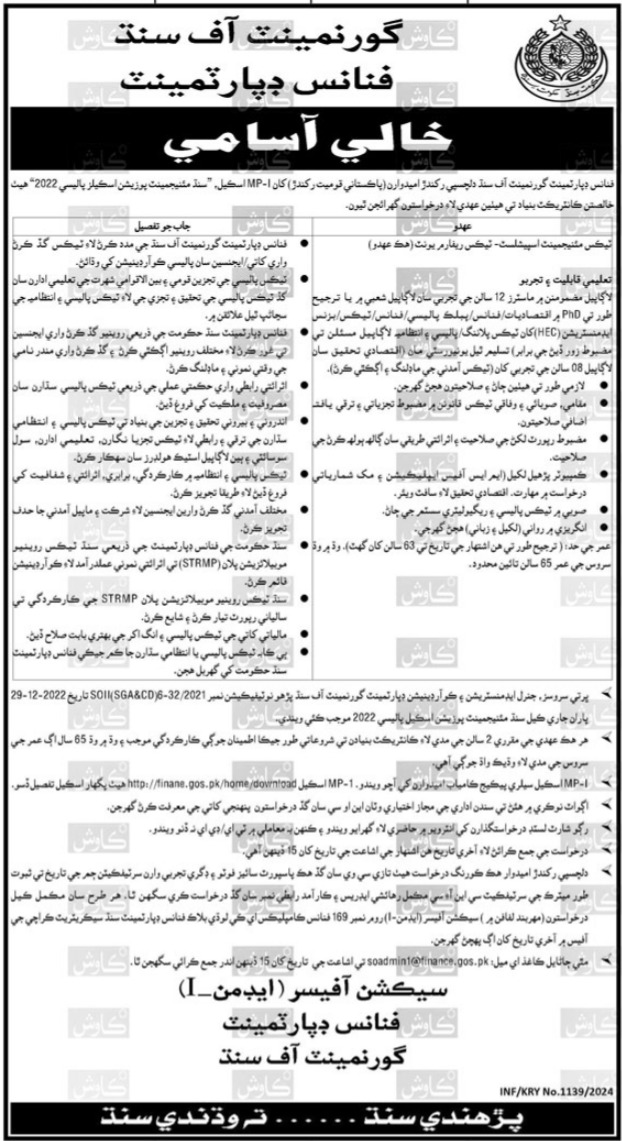 Vacant posts including tax management specialist are announced in Finance Department Karachi, karachi Sindh Pakistan as per 25 April 2024 advertisement in daily Kawish Newspaper. Candidates with Bachelor, MS and Master etc. educational background will be preferred.
