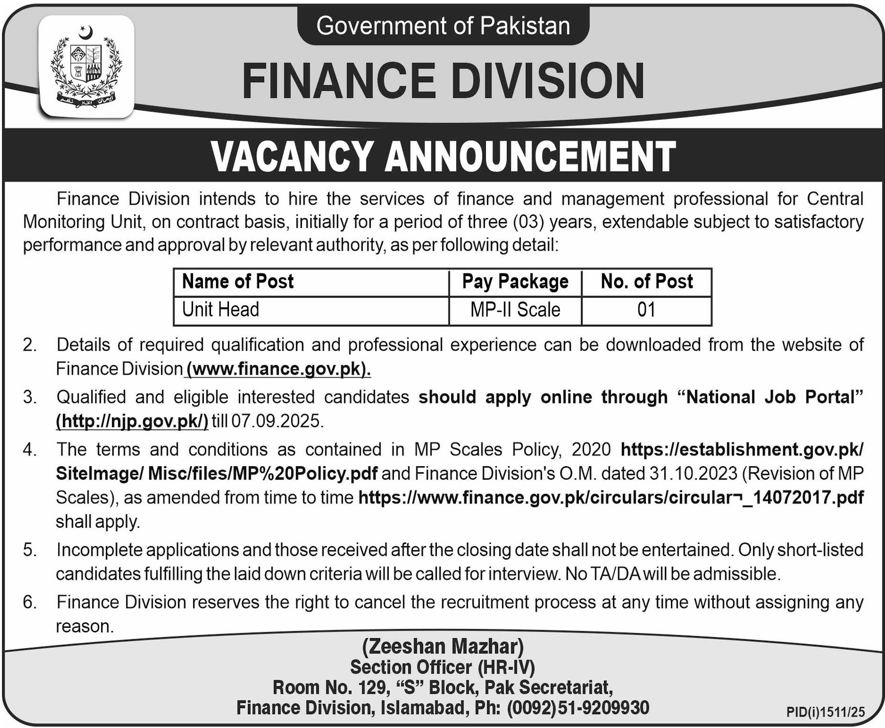 Finance Division Islamabad, islamabad Islamabad Pakistan invites applications from eligible candidates for the post of unit head as per advertisement of August 25, 2025 published in daily Other Newspaper. Preferred Education is Master, Bachelor and MS etc.