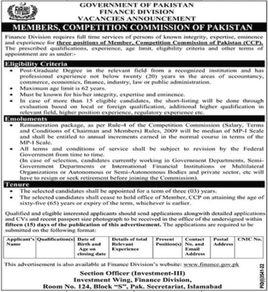 Finance Division Islamabad, islamabad Islamabad Pakistan invites applications from eligible candidates for the post of member competition commission of pakistan and member ccp as per advertisement of December 6, 2022 published in daily Jang Newspaper. Candidates with Mphil, Master, P.G Diploma and MS etc. educational background will be preferred.