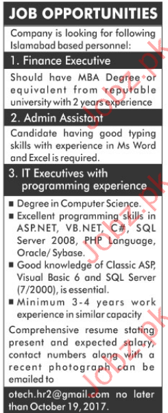 Finance Executive, Admin Assistant & IT Executive Jobs