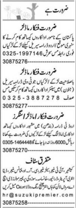 Private Company Lahore, lahore Punjab Pakistan invites applications from eligible candidates for the post of model, cashier, cook, sales manager, singer, driver, actor, it manager, guest relations officer, finance manager, khansama, gro and data entry operator as per advertisement of March 27, 2024 published in daily Express Newspaper. Matric, Intermediate, Bachelor, Middle, I.com, B.com and BA etc. educational qualification will be preferred.