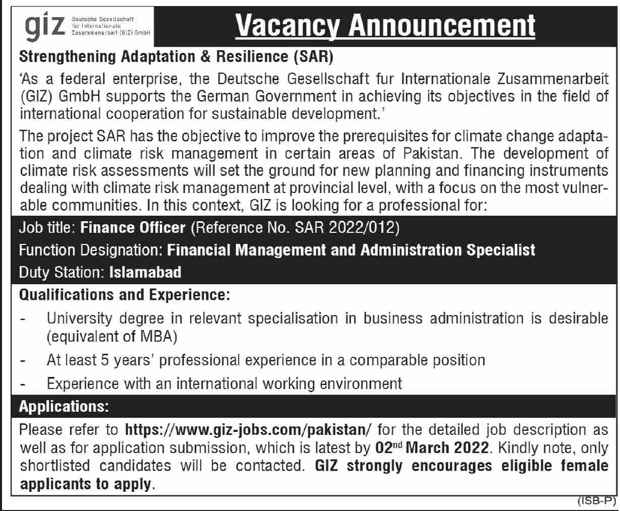 GIZ Pakistan jobs advertisement dated about 17 February 2022 in daily Dawn Newspaper invites application for the vacant post of Finance Officer in Islamabad Pakistan. Persons with MBA etc. education can apply.