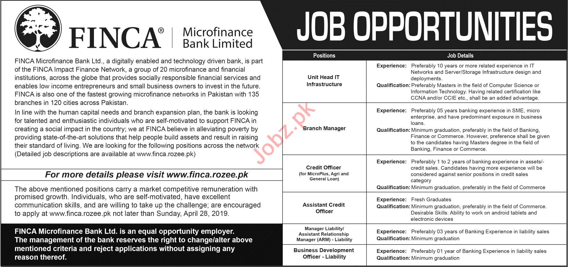 FINCA Microfinance Bank Limited is inviting application from experienced candidates for the posts of Unit Head IT Infrastructure, Branch Manager, Credit Officer, Assistant Credit Officer, Manager Liability, Assistant Relationship Manager, Business Development Officer in Lahore. Interested candidates can contact on given details for more information