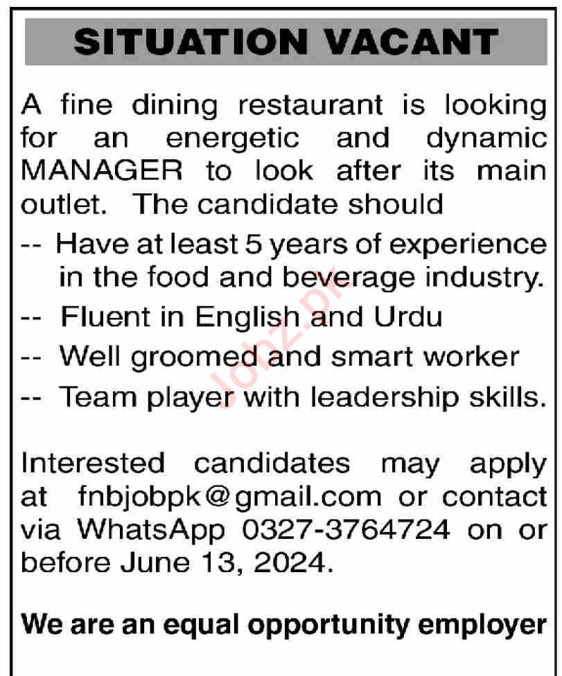 Fine Dining Restaurant is looking for candidates for following posts as per job advertisement published in daily Dawn Newspaper of June 9, 2024 for location Karachi, karachi Sindh Pakistan:
