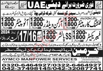 Aymco Manpower Services UAE, dubai UAE invites applications from eligible candidates for the post of finishing carpenter, ss polisher, auto painter, argon welder and fabricator as per advertisement of August 11, 2024 published in daily Express Newspaper. Middle etc. educational qualification will be preferred.
