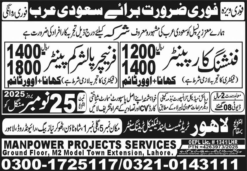 Lahore Trade Test & Technical Training Center jobs advertisement dated about 25 November 2025 in daily Express Newspaper invites application for the vacant post of painter, furniture polisher and finishing carpenter in Dammam, taif Saudi Arabia. Intermediate, Matric and Middle etc. educational qualification will be preferred.