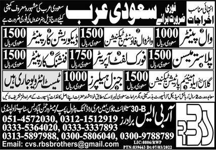 RBS Brothers jobs advertisement dated about 9 March 2022 in daily Express Newspaper invites application for the vacant post of glass partition technician, water valve fountain technician, decoration carpenter, plaster mason, wall painter, finishing carpenter, aluminum partition technician, general helper and fork lift operator in Riyadh, riyadh Saudi Arabia. Persons with Matric and Intermediate etc. education can apply.