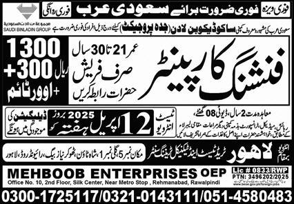 Lahore Trade Test & Technical Training Center invites applications for job positions advertised in daily Express dated 12 April 2025 for following vacancies in Jeddah, taif Saudi Arabia.