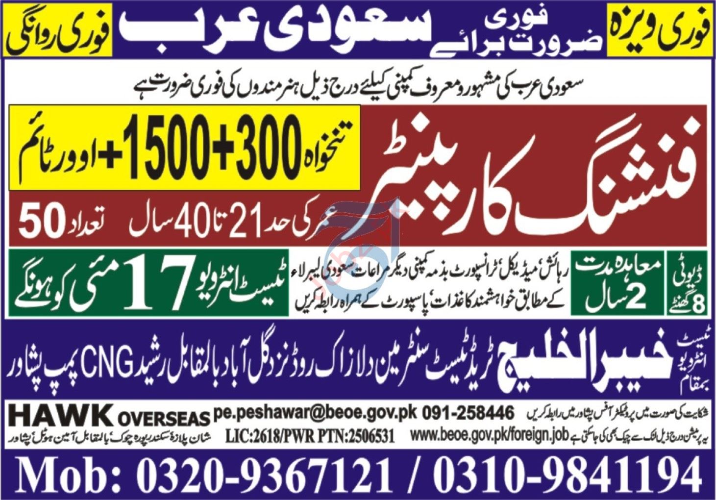 Hawk Overseas Riyadh, riyadh Saudi Arabia invites applications from eligible candidates for the post of finishing carpenter as per advertisement of May 12, 2024 published in daily Aaj Newspaper. Preferred Education is Middle etc.