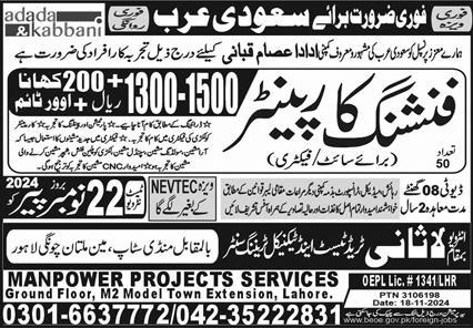 Vacant posts including finishing carpenter are announced in Lasani Trade Test & Technical Training Center Riyadh, tabuk Saudi Arabia as per 22 November 2024 advertisement in daily Express Newspaper. Persons with Matric and Intermediate etc. education can apply.