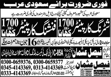 Faisal Usman Overseas Employment Promoters jobs advertisement dated about 16 June 2022 in daily Express Newspaper invites application for the vacant post of finishing carpenter and shuttering carpenter in Dammam, dammam Saudi Arabia. Candidates with Matric, Intermediate and Middle etc. educational background will be preferred.