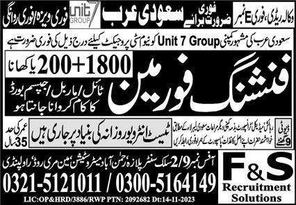 F & S Recruitment Solutions invites applications for job positions advertised in daily Express dated 2 January 2024 for following vacancies in Jeddah, dammam Saudi Arabia.