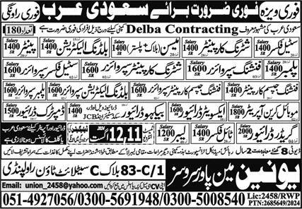 Union Manpower Services is looking for candidates for following posts as per job advertisement published in daily Express Newspaper of August 2, 2024 for location Riyadh, dammam Saudi Arabia: