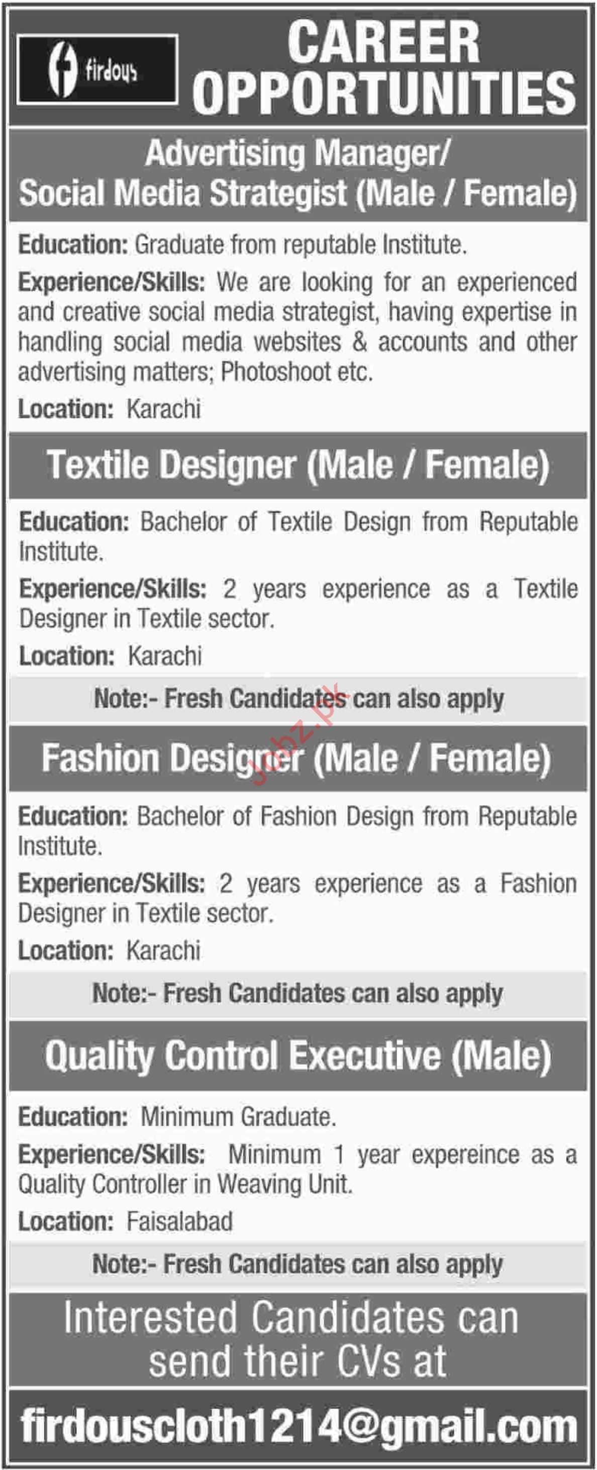 Vacancies in Firdous Cloth Mills Pvt Limited Advertisement April 2019