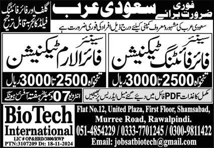 BioTech International Riyadh, dammam Saudi Arabia invites applications from eligible candidates for the post of fire fighting technician and fire alarm technician as per advertisement of December 5, 2024 published in daily Express Newspaper. Intermediate, Matric, Bachelor and DAE etc. educational qualification will be preferred.