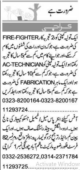 Private Company Karachi, karachi Sindh Pakistan invites applications from eligible candidates for the post of ac technician, fire fighter, computer operator and fabricator as per advertisement of June 26, 2024 published in daily Express Newspaper. Candidates with Middle, Matric, Intermediate and Bachelor etc. educational background will be preferred.