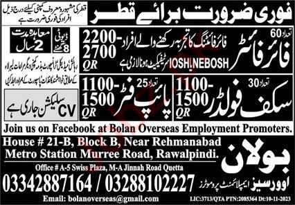 Bolan Overseas Employment Promoters invites applications for job positions advertised in daily Express dated 12 November 2023 for following vacancies in Qatar, qatar Qatar.