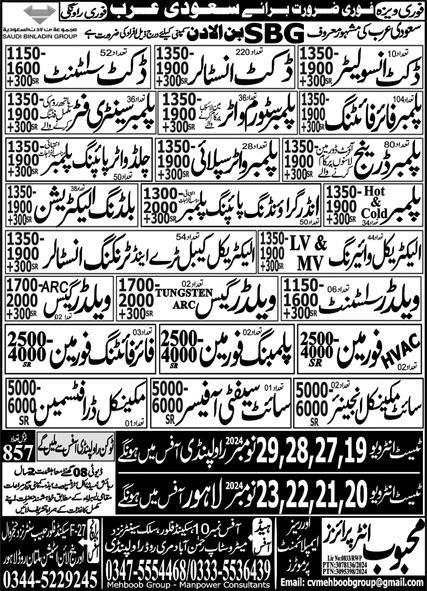 Vacant posts including hvac technician assistant, hvac foreman, plumber store room water, plumber sanitary fitter, site safety officer, fire fighting foreman, plumber water supply, electrical wiring, plumber firefighting, chilled water piping, electrical technician mv, shield metal welding, duct insulator, arc welder, building electrician, firefighting foreman, welder assistant, plumbing foreman, site mechanical engineer, plumber fire fighting, gas welder, plumber, plumber drainage, electrical lv technician, electrical cable tray installer and duct man are announced in Mehboob Enterprises Overseas Employment Promoters Dammam, taif Saudi Arabia as per 16 November 2024 advertisement in daily Express Newspaper. Intermediate, Bachelor, B.E, DAE and Matric etc. educational qualification will be preferred.