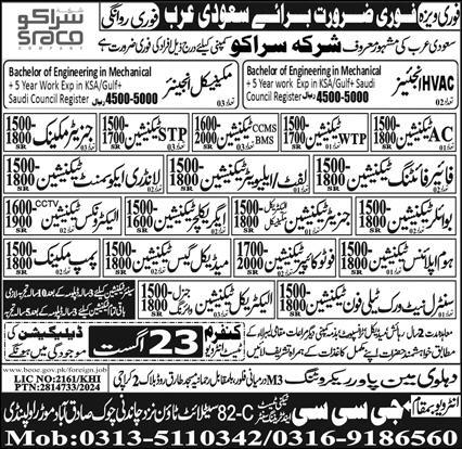 Vacant posts including agriculture technician, electronics technician, pump mechanic, photocopier technician, bms technician, home appliances technician, laundry equipment technician, generator mechanic, fire fighting technician, electrical technician, generator technician, elevator technician, boiler technician, hvac engineer, medical gas technician, mechanical engineer, central network telephone technician, lift technician, stp technician, ac technician, cctv technician, ccms technician and wtp technician are announced in GCC Techni Test & Training Center Riyadh, dammam Saudi Arabia as per 22 August 2024 advertisement in daily Express Newspaper. Educational qualifications required B.E, Intermediate, DAE, Matric and Bachelor etc.
