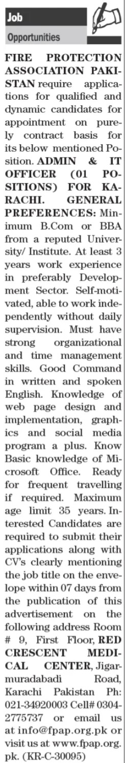 Fire Protection Association of Pakistan FPAP Karachi, karachi Sindh Pakistan invites applications from eligible candidates for the post of admin officer and it officer as per advertisement of June 27, 2024 published in daily The News Newspaper. B.com and BBA etc. educational qualification will be preferred.