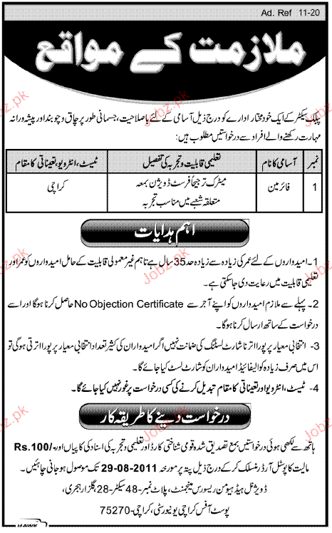 Apply as per details in job advertisement. Login to view further details of how to apply via https://www.jobz.pk online.