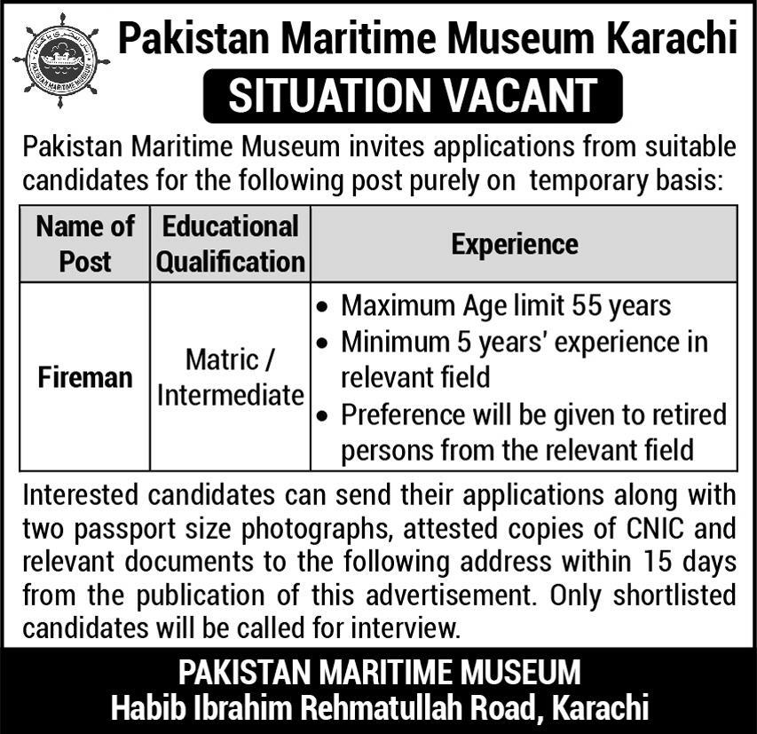 Pakistan Maritime Museum jobs advertisement dated about 18 January 2024 in daily Express Newspaper invites application for the vacant post of fireman in Karachi, karachi Sindh Pakistan. Persons with Intermediate and Matric etc. education can apply.