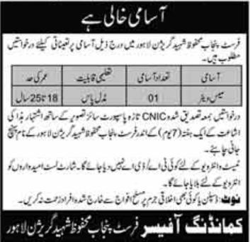 Latest Government jobs in First Punjab Mehfoz Shaheed Garrison in Labor and others can be applied till NaN undefined NaN or as per closing date in newspaper ad. Read complete ad online to know how to apply on latest First Punjab Mehfoz Shaheed Garrison job opportunities.