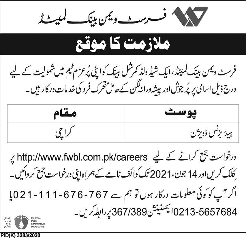 Vacancies in First Women Bank Limited Advertisement May 2021