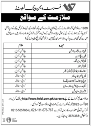 First Women Bank Limited is looking for candidates for following posts as per job advertisement published in daily Jang Newspaper of August 7, 2022 for location Karachi, karachi Sindh Pakistan:
