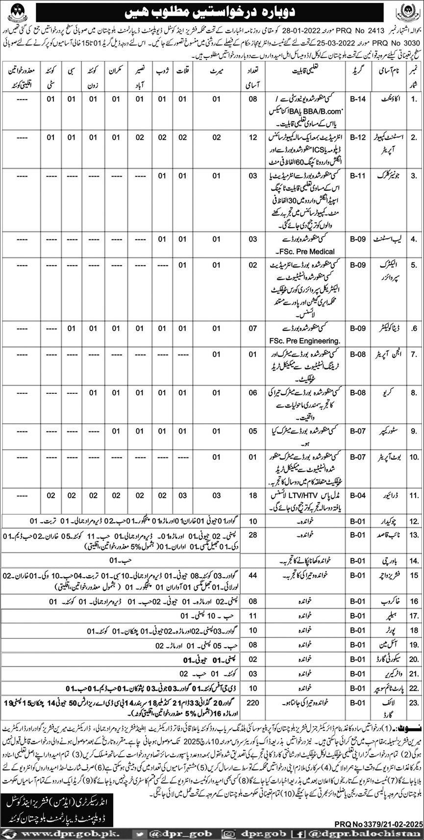 Balochistan Coastal Development Authority BCDA jobs advertisement dated about 22 February 2025 in daily Jang Newspaper invites application for the vacant post of store keeper, fisheries watcher, data collector, sweeper, electric supervisor, porter, clerk, naib qasid, assistant computer operator, water carrier, htv driver, helper, chowkidar, bawarchi, cook, accountant, security guard, crew, boat operator, lab assistant, khakroob, oil man, life guard, ltv driver and engine operator in Cantt Quetta, kalat, gwadar, panjgur, sibi, kharan, naseerabad, quetta, turbat, makran, zhob, hub and dera murad jamali Balochistan Pakistan. Preferred Education is Middle, Bachelor, DAE, Primary, BA, Matric, B.com, BBA and Intermediate etc.