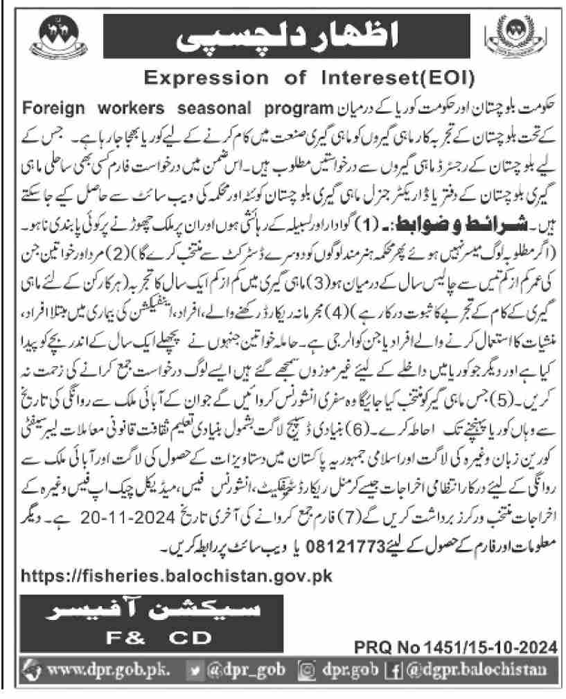 Fisheries Department Quetta, quetta Balochistan Pakistan invites applications from eligible candidates for the post of mahigir and worker as per advertisement of October 17, 2024 published in daily Dawn Newspaper. Persons with Intermediate, Matric and Middle etc. education can apply.