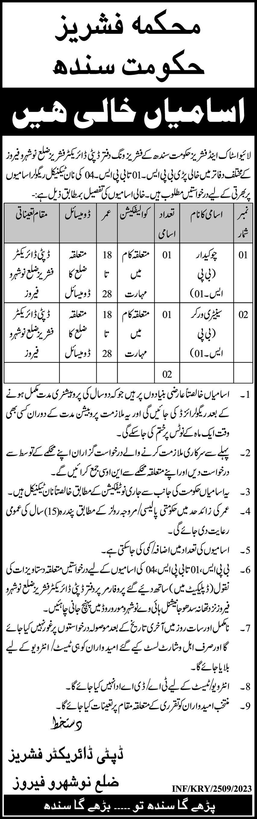 Fisheries Department invites applications for job positions advertised in daily Express dated 17 June 2023 for following vacancies in Naushahro Feroze, naushahro feroze Sindh Pakistan.