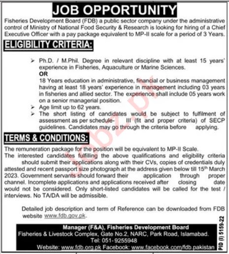 Fisheries Development Board invites applications for job positions advertised in daily Jang dated 19 February 2023 for following vacancies in Islamabad, islamabad Islamabad Pakistan.