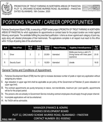Fisheries Development Board FDB Jobs 2020 For Islamabad