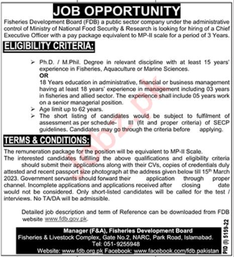 Fisheries Development Board jobs advertisement dated about 19 February 2023 in daily Jang Newspaper invites application for the vacant post of chief executive officer in Islamabad, islamabad Islamabad Pakistan. Phd and Mphil etc. educational qualification will be preferred.