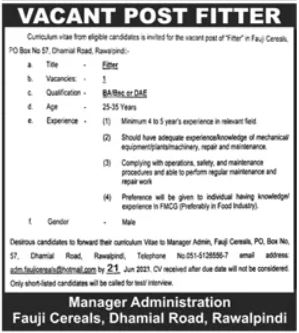 Vacant posts including fitter are announced in Fauji Cereals Mills Rawalpindi, rawalpindi Punjab Pakistan as per 16 June 2023 advertisement in daily Dunya Newspaper. Preferred Education is DAE and BA etc.