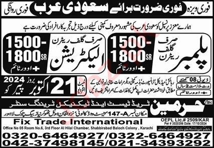 Fix Trade International Riyadh, riyadh Saudi Arabia invites applications from eligible candidates for the post of electrician and plumber as per advertisement of October 21, 2024 published in daily Express Newspaper. Primary, Middle and Matric etc. educational qualification will be preferred.