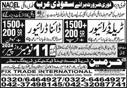 Vacant posts including daina driver and traila driver are announced in Fix Trade International Riyadh, riyadh Saudi Arabia as per 9 November 2024 advertisement in daily Express Newspaper. Educational qualifications required Matric, Primary and Middle etc.