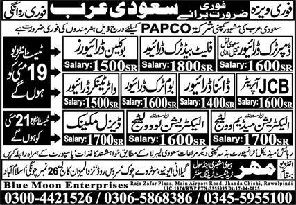 Blue Moon Enterprises invites applications for job positions advertised in daily Express dated 17 May 2025 for following vacancies in Dammam, jeddah Saudi Arabia.