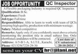 Flexible Packaging Company jobs advertisement dated about 13 October 2024 in daily Jang Newspaper invites application for the vacant post of qc inspector in Karachi, karachi Sindh Pakistan. Educational qualifications required Bachelor etc.