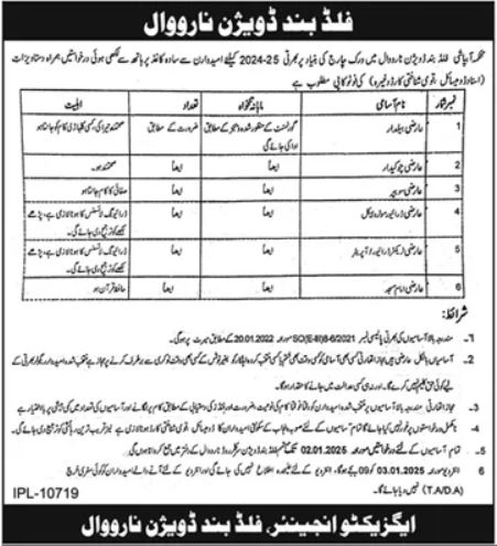 Flood Band Division, Irrigation Department jobs advertisement dated about 25 December 2024 in daily Dunya Newspaper invites application for the vacant post of imam masjid, tractor driver, tractor operator, driver motor vehicle, chowkidar, baildar, sweeper and driver in Narowal, narowal Punjab Pakistan. Preferred Education is Primary and Middle etc.
