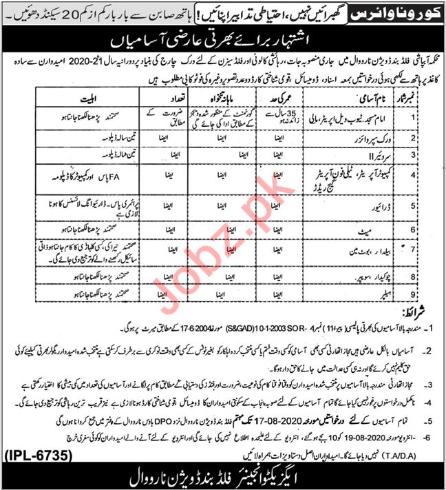 Flood Band Division Narowal Jobs 2020 For Work Supervisor